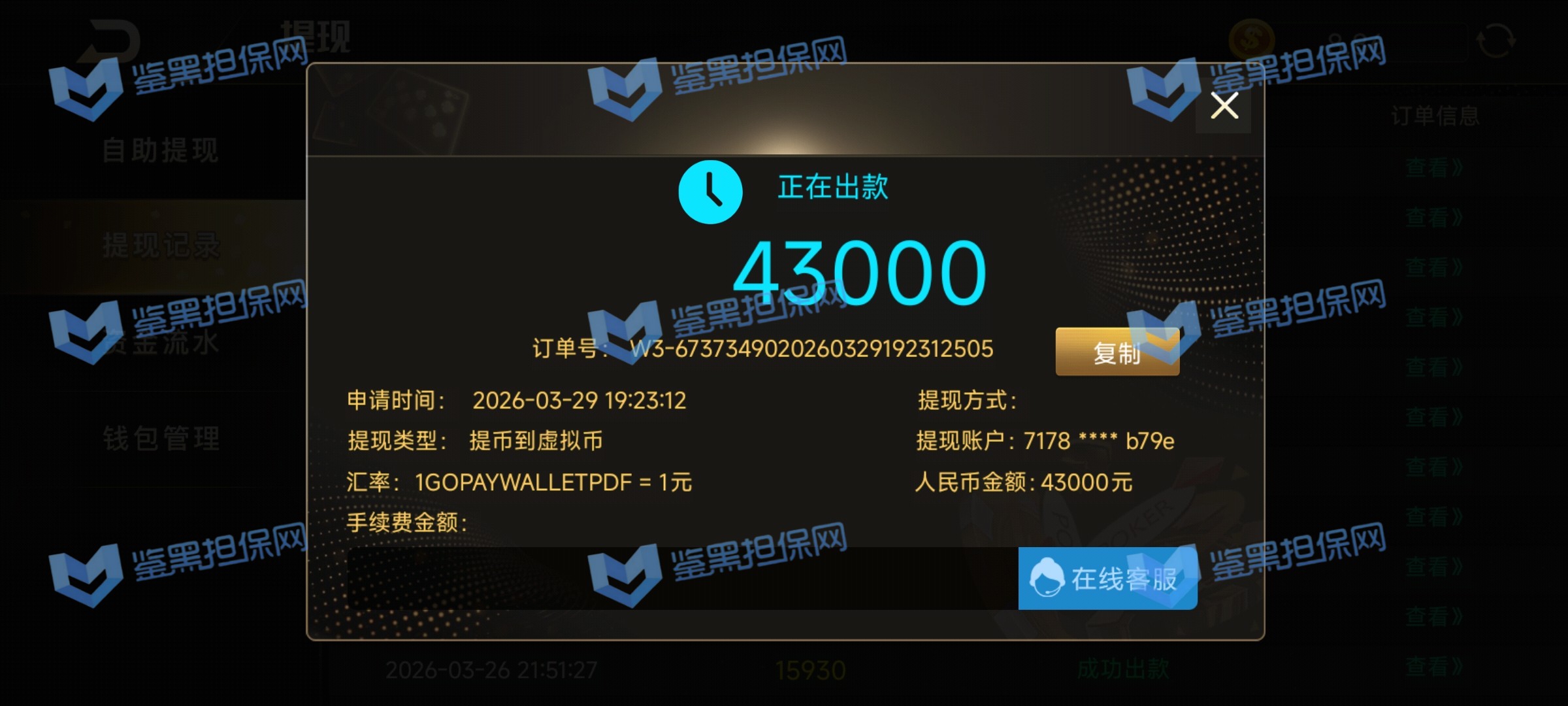 3、提款43000从此会员留言得知已经完成出款事宜,但是担保网不建议继续在此继续投注游戏,避免后续以其他理由拒绝出款造成损失。